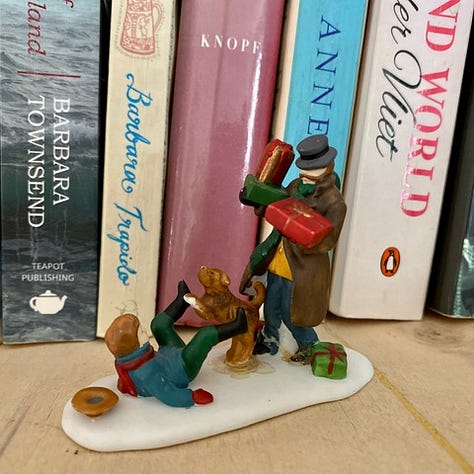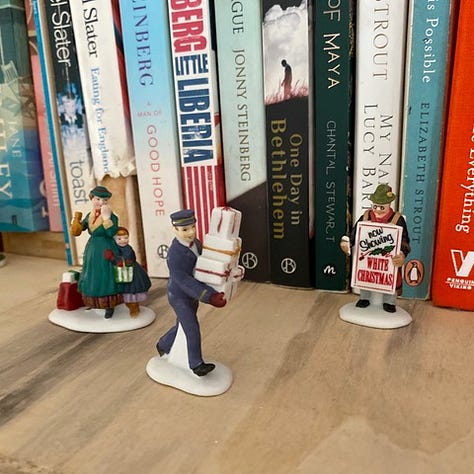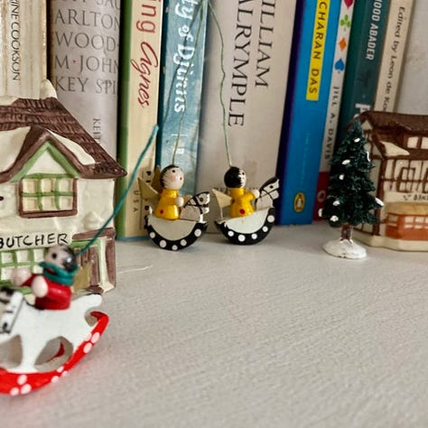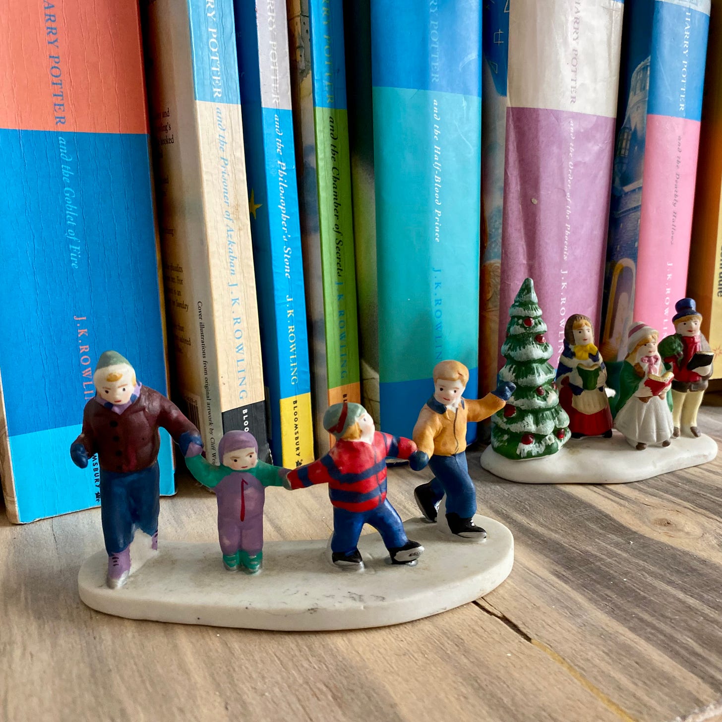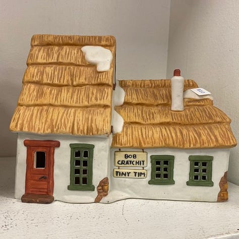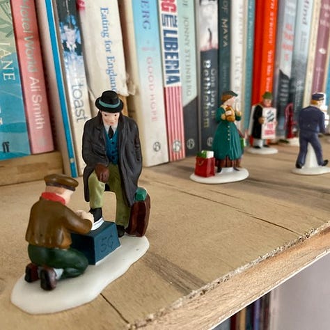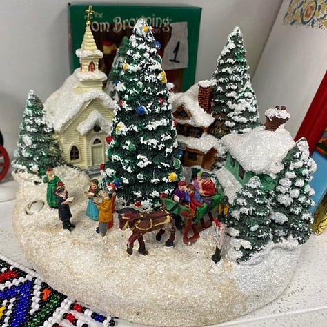 I told Maura I’d seen a lot of Christmas ‘minis’ at my local charity shop. I’d seen hand-painted, light-up houses. I’d bought a set of dear little handpainted Christmas figures (that look like extras in the street scenes of period Christmas rom-coms). Maura said some of them were Department 56. They’re stamped underneath, and each one has a model number. They’re handpainted and collectable.