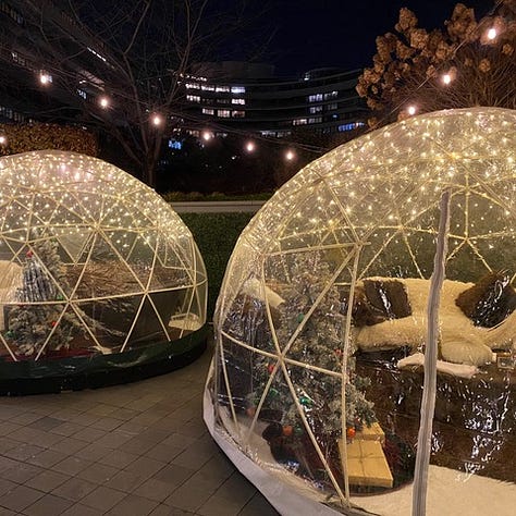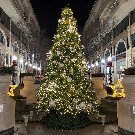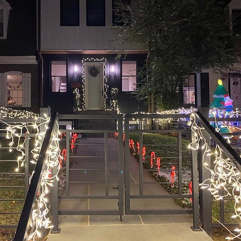 I’ve seen giant, inflatable snowmen and a pathway lined with giant candy canes. Splindly, lit-up groups of reindeer are popular on front lawns. Hedges are netted with Christmas lights. Strings of bulbs spiral up even the tallest trees.