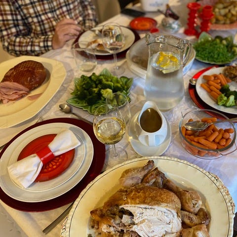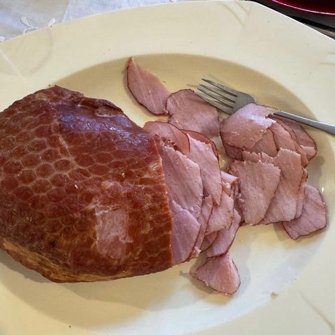 At Thanksgiving, I was obliged to serve a wildly expensive “ham” that was terribly salty, in addition to being unglazed. There was no layer of fat. The meat held its shape when you cut it. That’s no good. You want it to be so moist it flops at the knee.