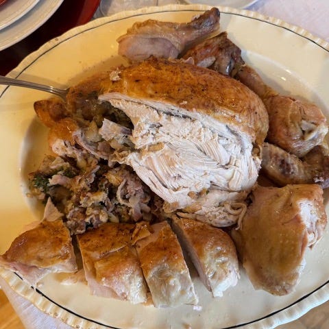 A normal-sized chicken for roasting is called a “young chicken”. Everyone roasts turkeys – for Thanksgiving and Christmas. The debate used to be “brined or unbrined”? These days people deep-fry. It has to be done outside, and there’s a special machine, but people swear by the crispiness without, the tenderness within, the speed – and the freeing up of oven space.
