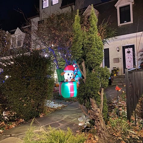 Our neighbourhood newspaper, the Burleith Bell, awards prizes every year for the best yard decor. Some houses decorate three storeys up.